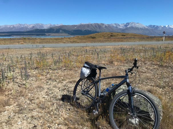 Today I rented a bicycle and followed both Te Araroa and the Alps2Ocean trails (they follow the same route) 54km to Twizel. There is no camping for the first 45km south of Lake Tekapo, and since I cannot walk that far in a day, I decided to try my hand at riding a bike. While I think I would enjoy bicycle touring, I learned a valuable lesson today. The muscle groups for backpacking and bicycling are completely different.